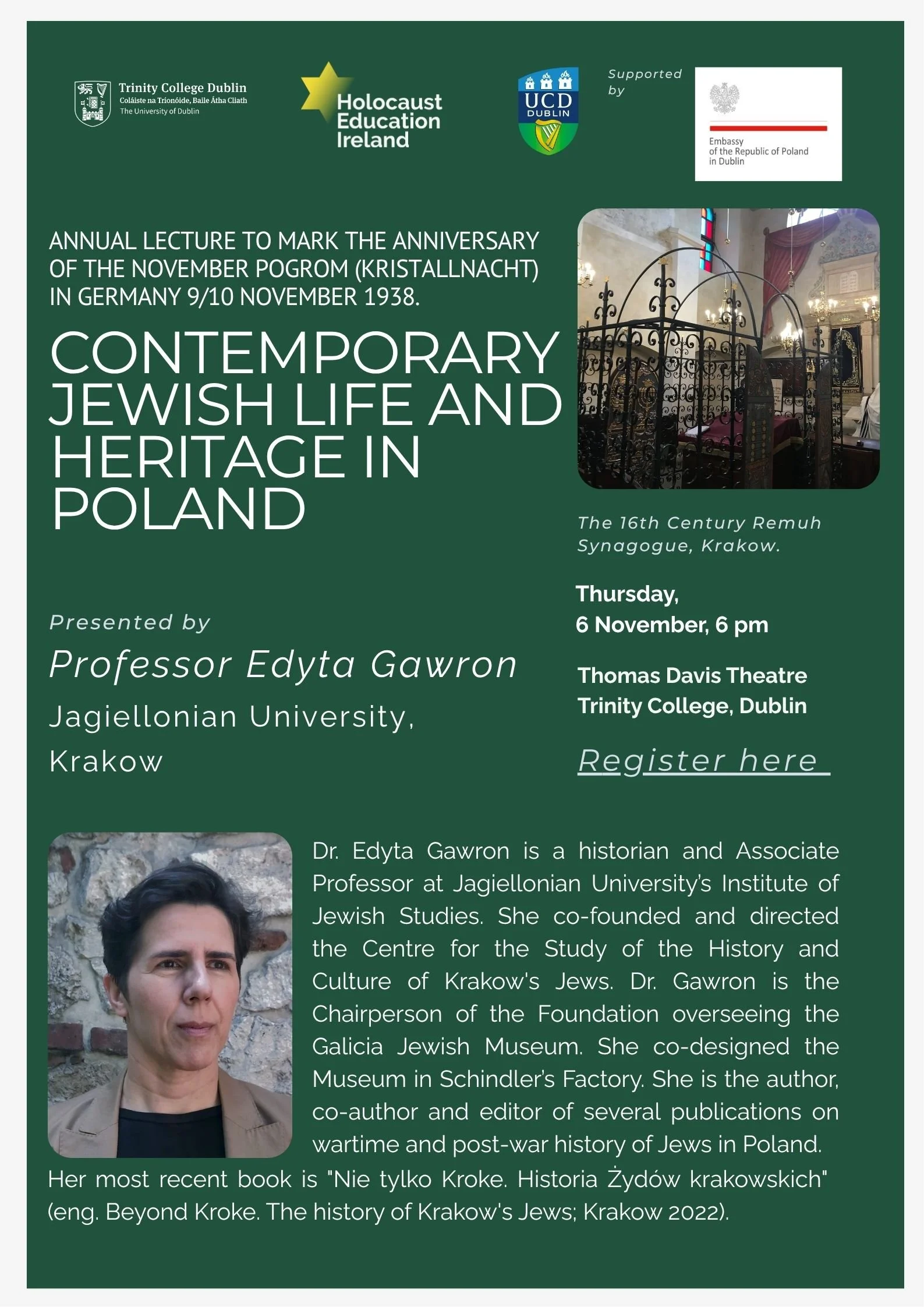 Our November lecture this year will be presented by Prof. Edyta Gawron from Krakow who will outline the history of the Jews of Poland and contemporary Jewish life and heritage in Poland today